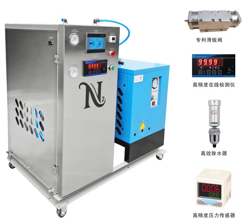 该型号氨气纯度达99.99%,侧边配置冷干机+三级过滤器,是激光焊接/激光切割/3D熔覆/3D打印等行业专用制氮机。采用高精度测氮仪,具有报警功能,自动停机功能。通过对空气进行深度除水,冷干机+无热再生干燥机常压露点可达-50℃左右,压力露点达-30℃左右。